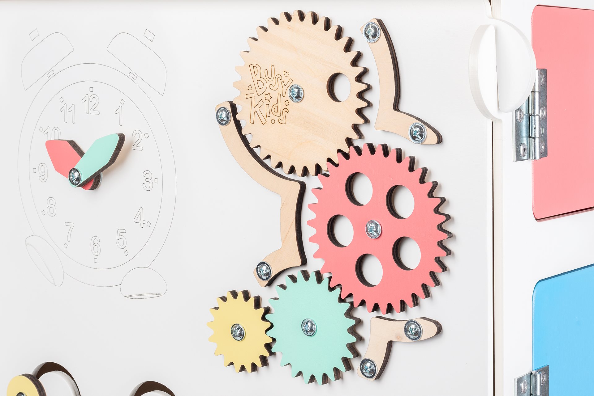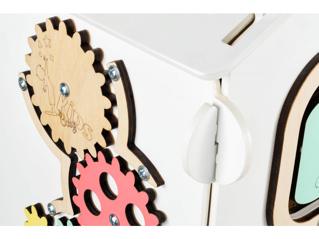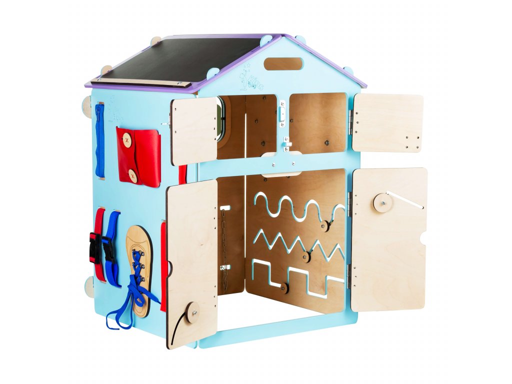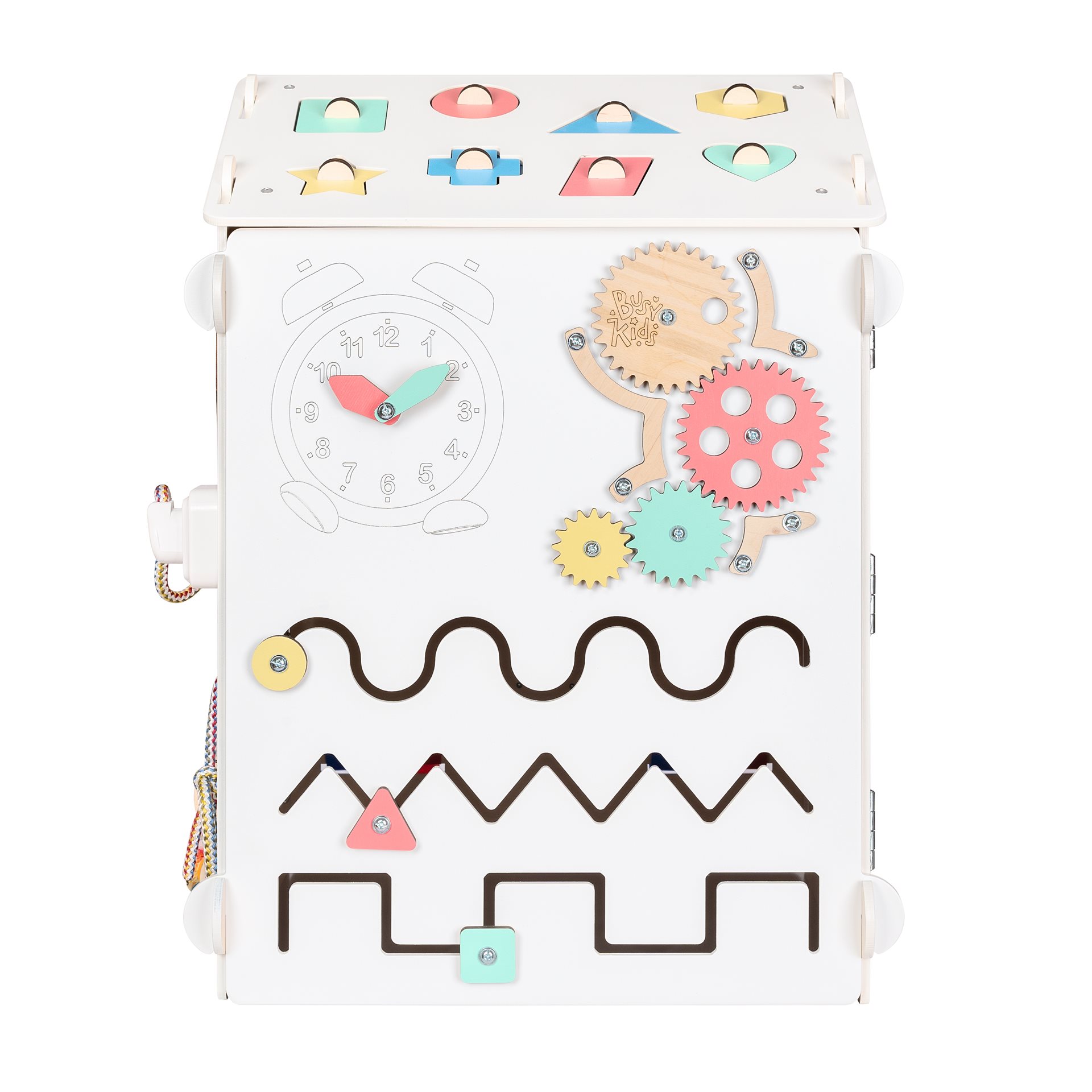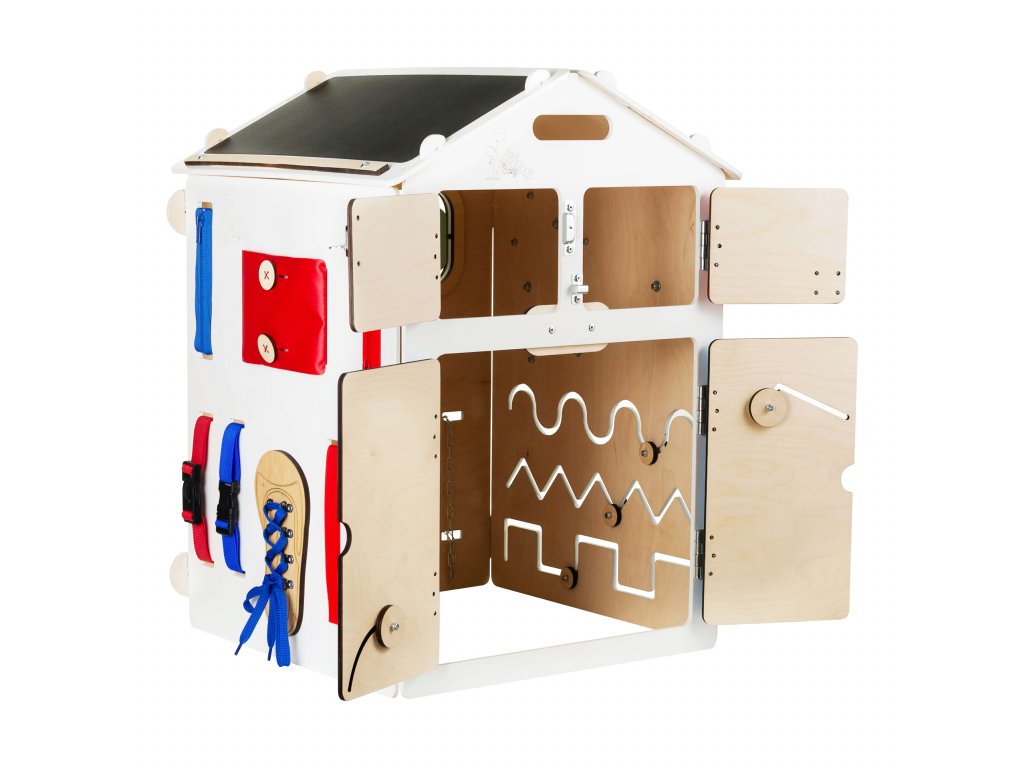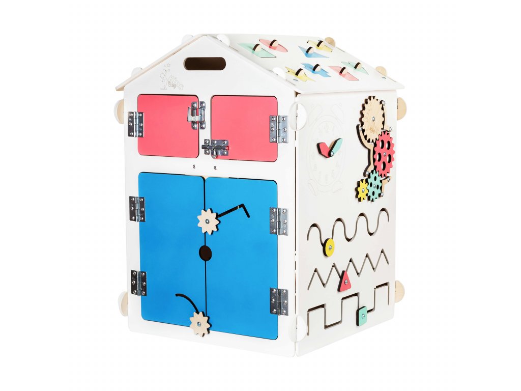Interaktivní hračky typu activity board jsou nyní stále populárnější. Dle pedagogického směru montessori vedou děti k učení se skrze jejich přirozenou chuť objevovat a hrát si. Náš Activity board v podobě skládacího domečku, v krásném designu s pastelovými prvky, posouvá tuto výukovou hračku na další úroveň.