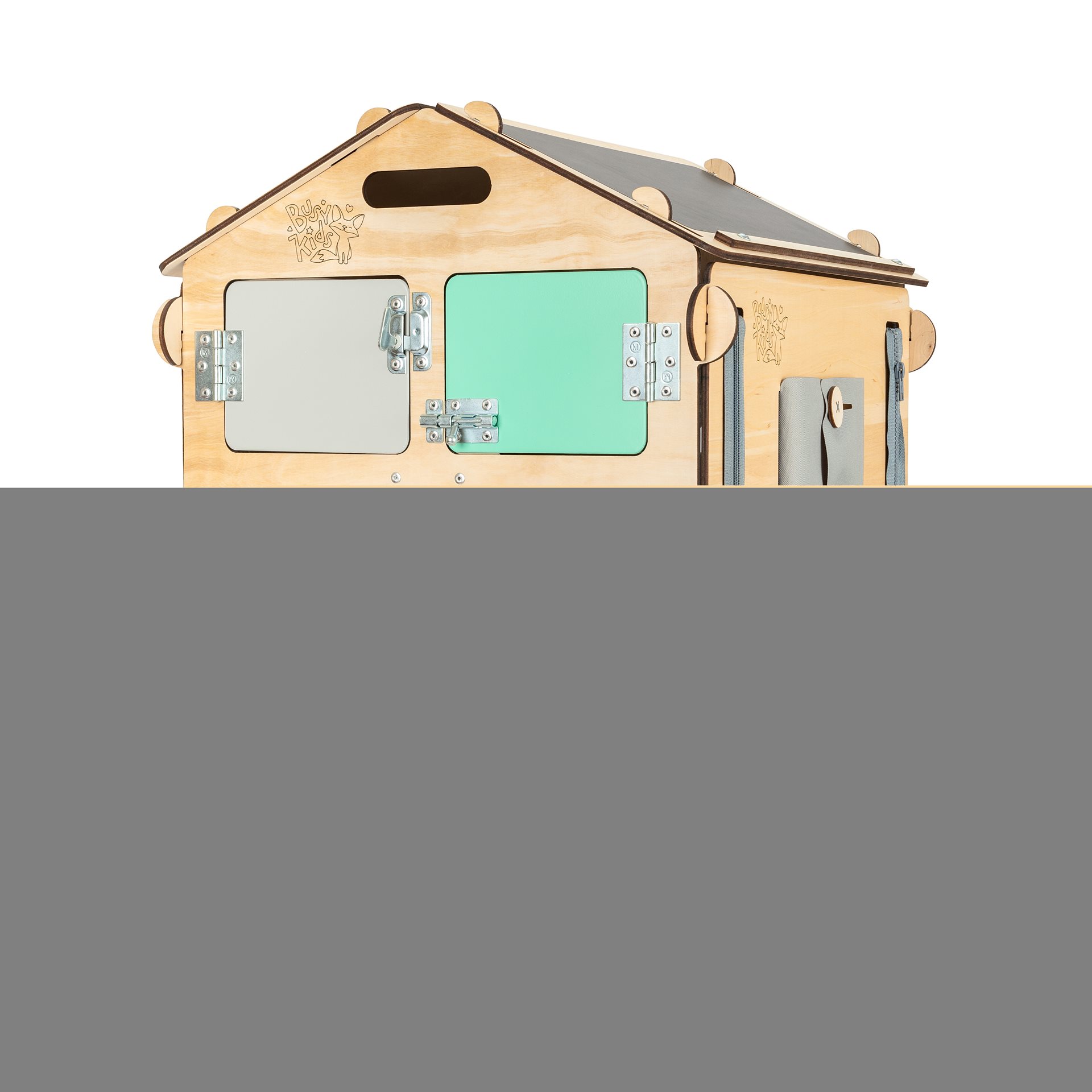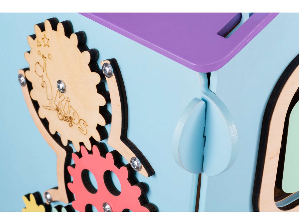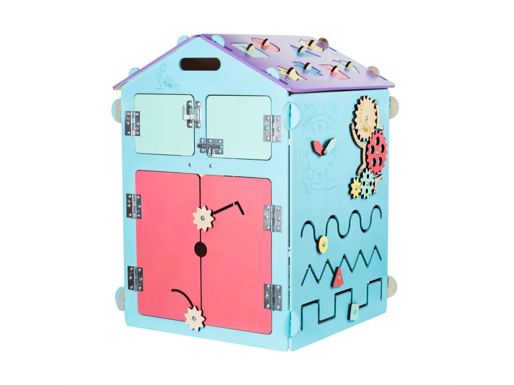 Interaktivní hračky typu activity board jsou nyní stále populárnější. Dle pedagogického směru montessori vedou děti k učení se skrze jejich přirozenou chuť objevovat a hrát si. Náš Activity board v podobě skládacího domečku, v krásném designu s pastelovými prvky, posouvá tuto výukovou hračku na další úroveň.