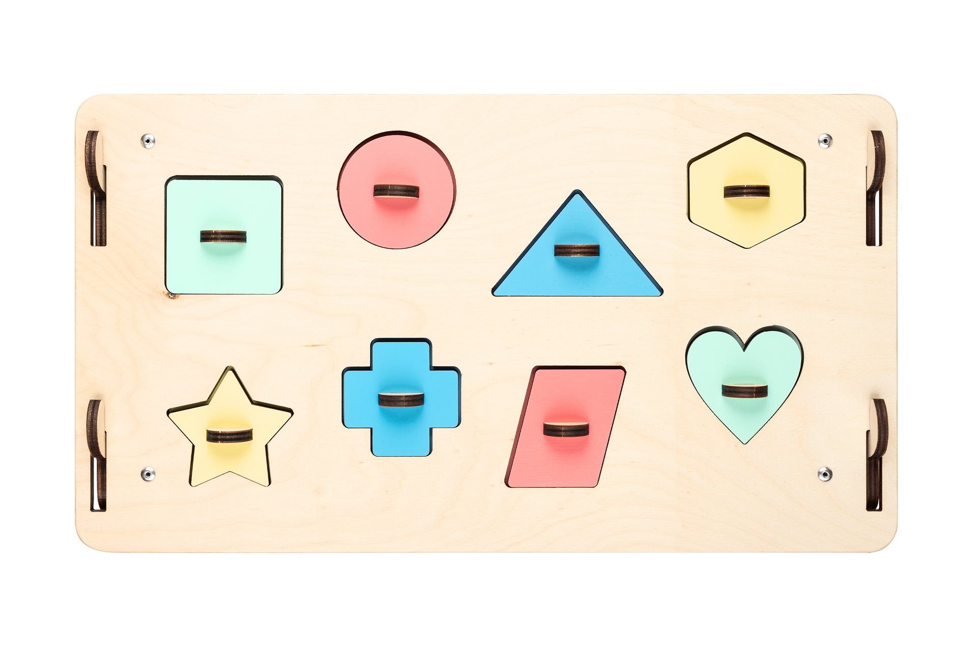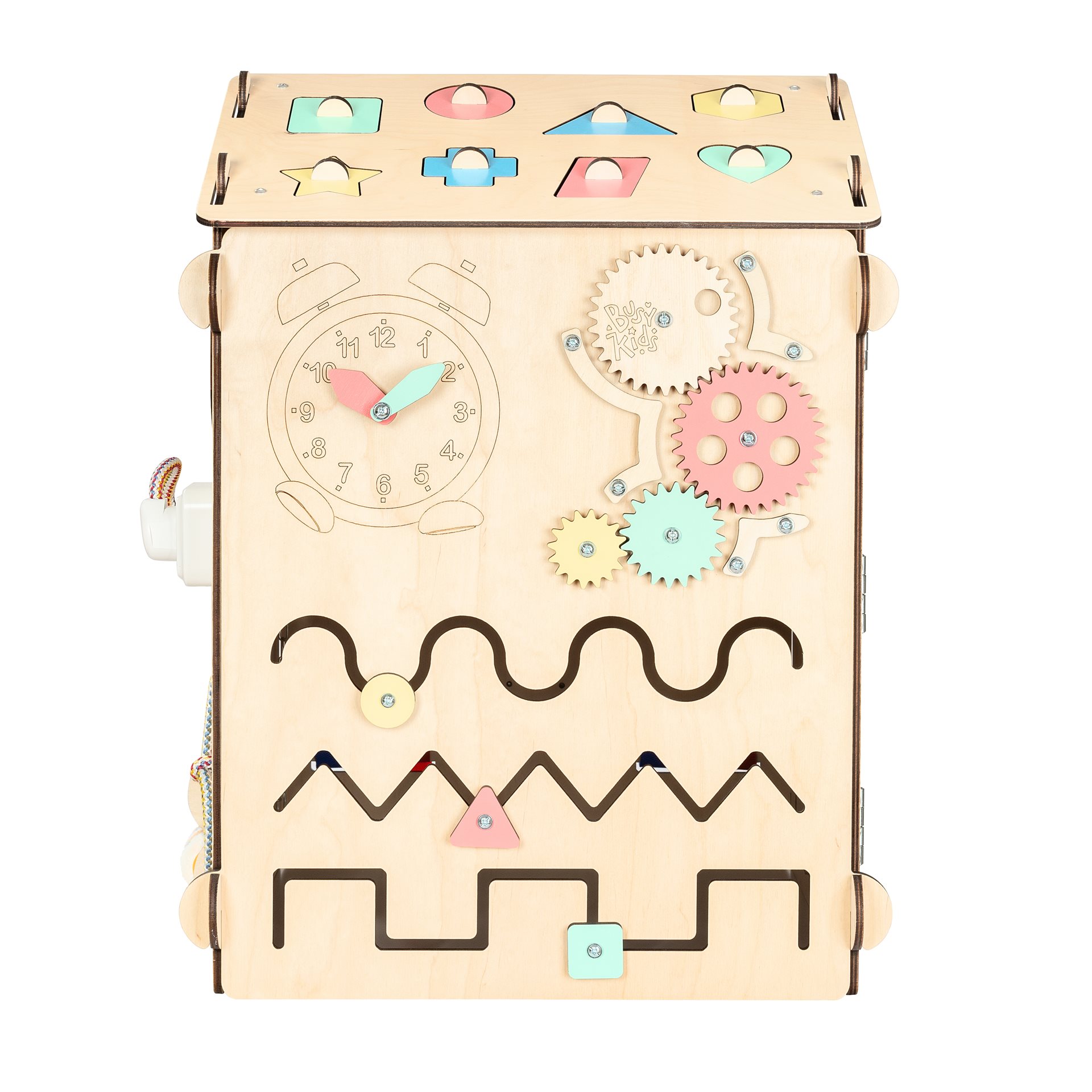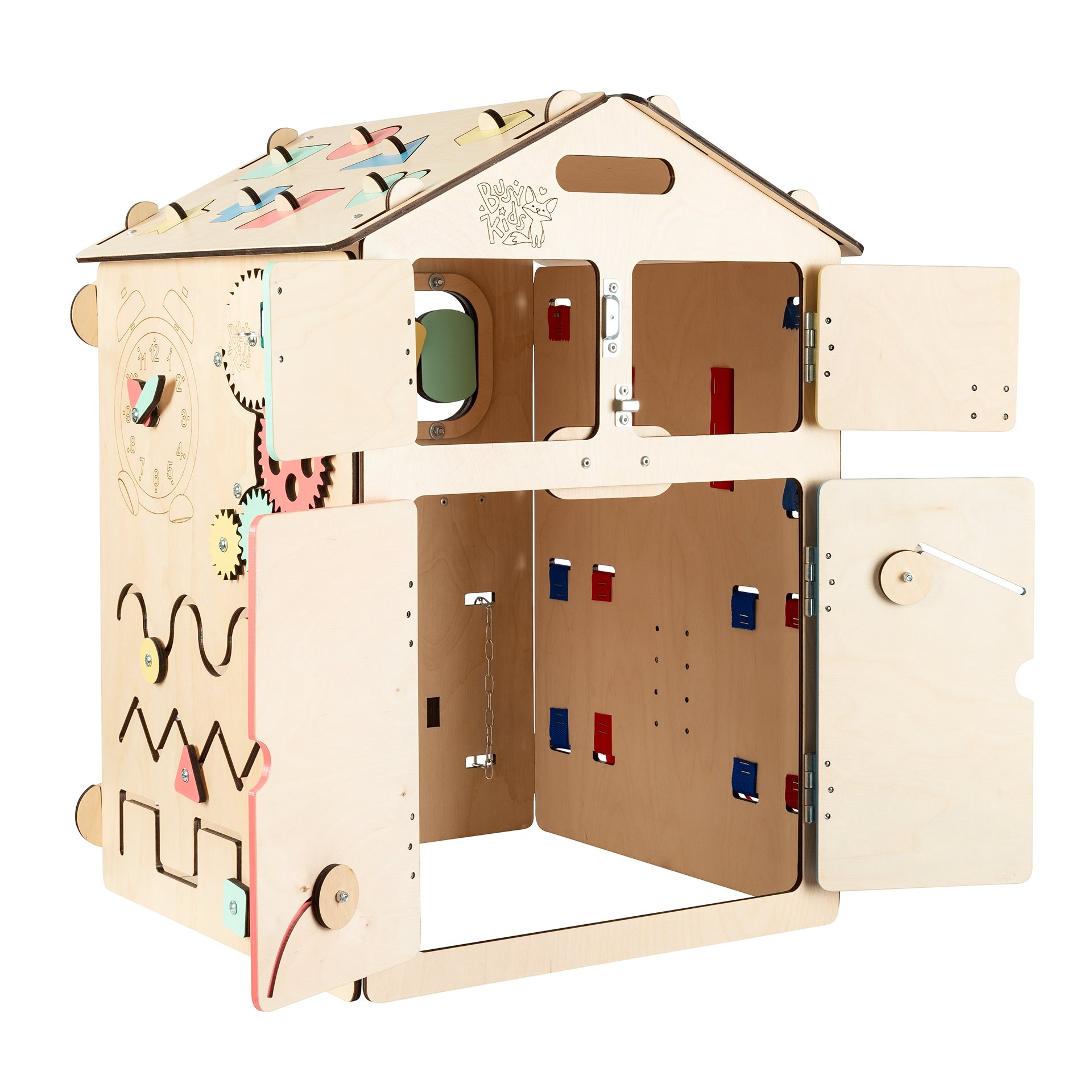 Interaktivní hračky typu activity board jsou nyní stále populárnější. Dle pedagogického směru montessori vedou děti k učení se skrze jejich přirozenou chuť objevovat a hrát si. Náš Activity board v podobě skládacího domečku, v krásném designu s pastelovými prvky, posouvá tuto výukovou hračku na další úroveň.