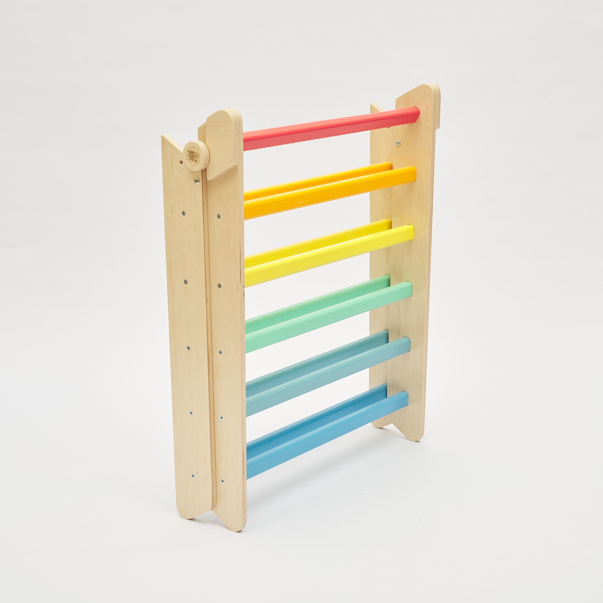Pikler trojúhelník lze kombinovat s dalšími našimi výrobky. V kombinaci s oboustranným prknem z jedné strany rozšíříte lezecké možnosti, otočením prkna pak vykouzlíte skluzavku. Přidáním Montessori houpačky, případně oboustranného prkna k houpačce, vytvoříte dětské hřiště v pokojíčku. Jistě navíc oceníte úžasnou skladnost hracích prvků.
