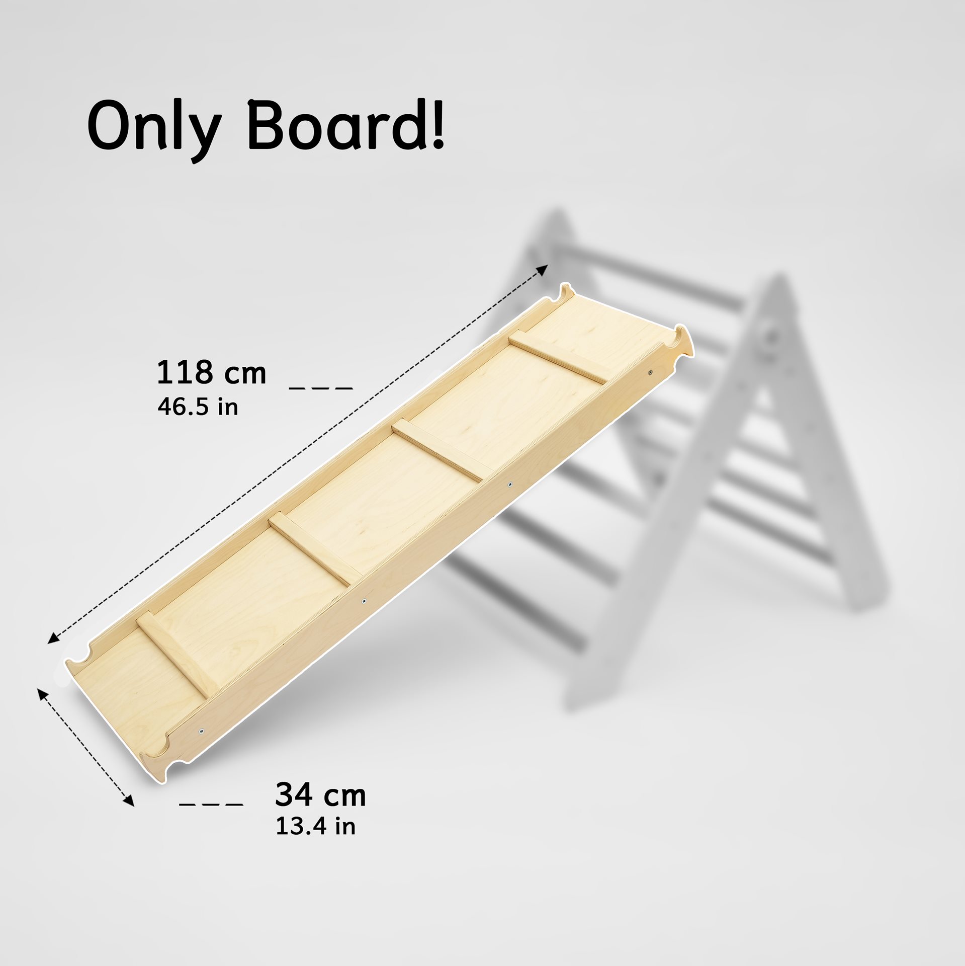 Prkno 1200 je oboustranně použitelná deska, která doplňuje Pikler trojúhelník.