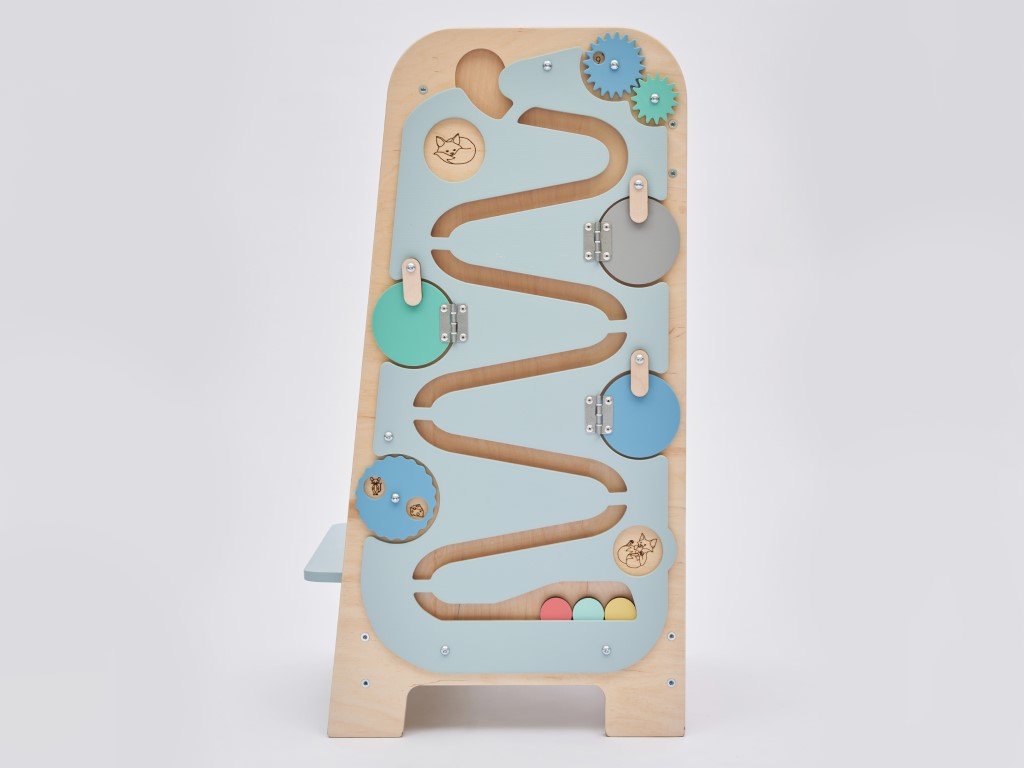 Jedna z bočních stran rostoucí učící věže je velkým activity boardem s kuličkovou dráhou, druhá pak představuje velkou kreslící tabuli pro kreslení křídami.